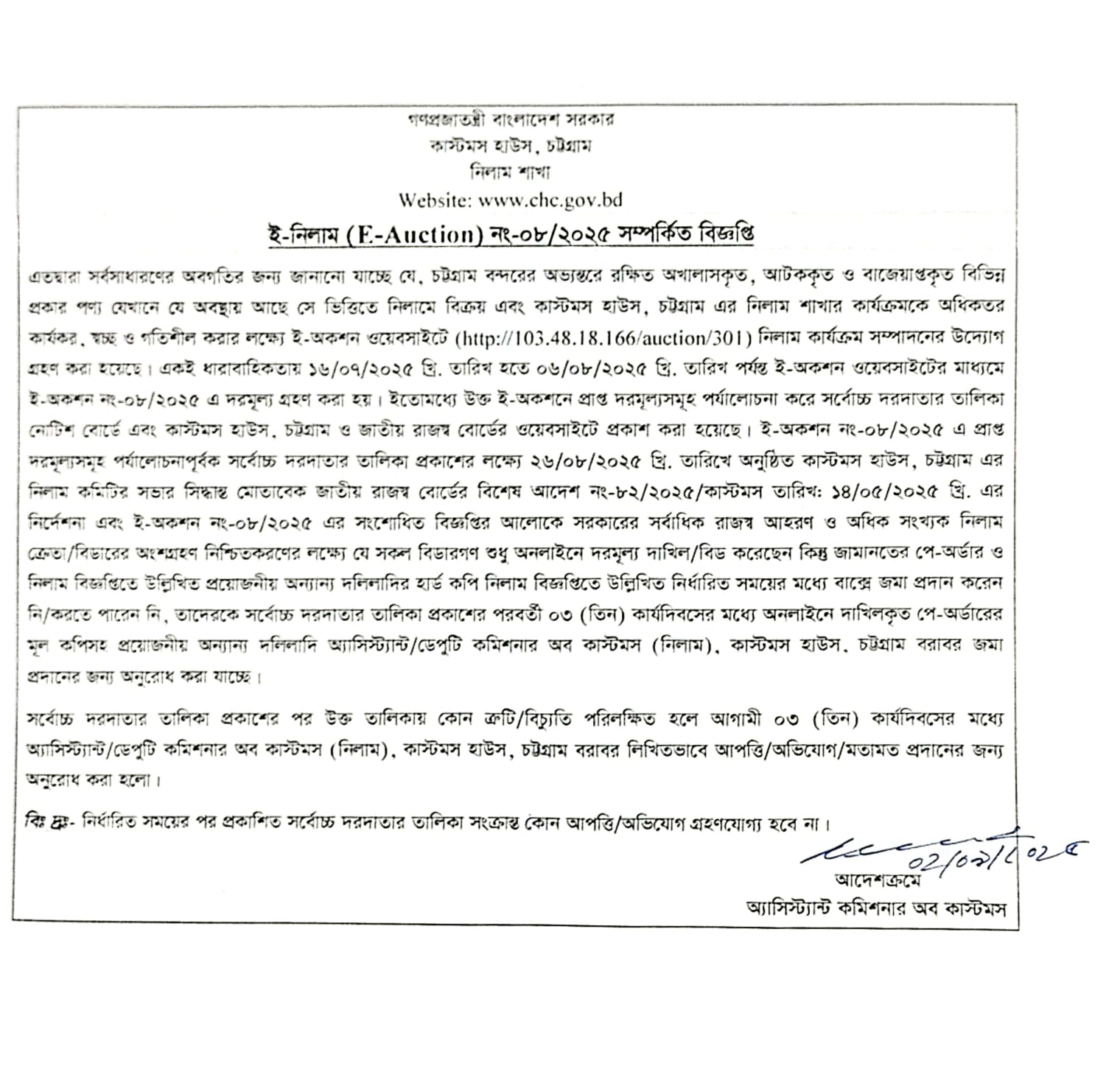640 কাস্টম হাউস, চট্টগ্রাম এর ই-নিলাম (E-Auction) নং-০৮/২০২৫ সম্পর্কিত বিজ্ঞপ্তি 08-09-2025